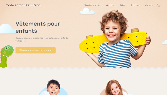 Vous pensez à vendre en ligne les vêtements pour enfants que vous confectionnez vous-même ? Sélectionnez ce template pour présenter et vendre vos créations ! Rendez votre site boutique unique et attirant grâce à un design irrésistible, des produits originaux et un processus de commande facile.
