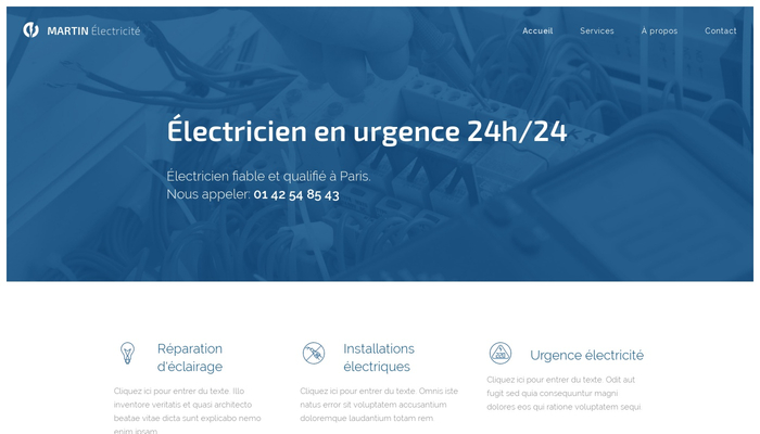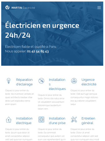 Un design professionnel pour les électriciens et tous les autres artisans. Le site est prêt à l'emploi, il ne vous reste plus qu' à ajouter votre numéro de téléphone, la liste des services proposés et de présenter votre expérience professionnelle. Les témoignages de clients satisfaits feront une bonne impression et vont convaincre vos clients que vous êtes un des meilleurs du marché.