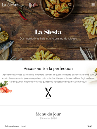 Le template intitulé La Siesta est idéal pour les restaurants, les cafés et les bars à vin. Ajoutez toutes les informations indispensables sur la page d'accueil pour permettre à vos visiteurs de trouver tout ce dont ils ont besoin - des plats du jour, des horaires d'ouverture et une rubrique contact.