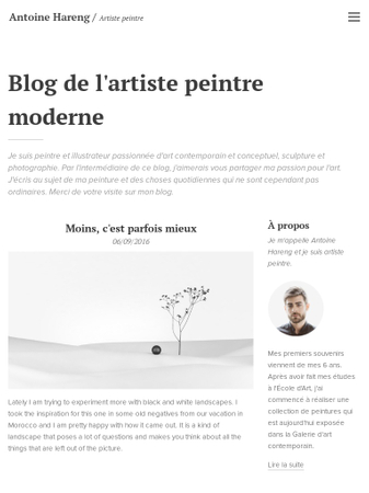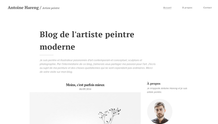 Un template idéal pour les âmes créatives. Partagez votre passion pour l'art, présentez vos œuvres, commentez les expositions, parlez des tendances graphiques et d'autres nouveautés artistiques. Le style minimaliste va mettre en valeur vos créations et supporter votre créativité. Ajoutez de nouveaux articles dans quelques secondes et tenez vos visiteurs au courant de l'actualité artistique.