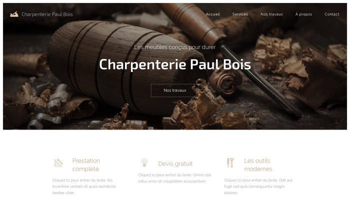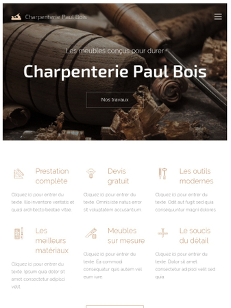 Ce template vous permettra de facilement fabriquer un site web impressionnant pour votre entreprise de charpente. Les couleurs à des tons terrestres et des icônes attractives vont parfaitement compléter les galeries photos présentant votre travail et vos produits. Postez les témoignages des clients satisfaits sur votre site web et affichez un numéro de téléphone bien visible pour que les visiteurs puissent vous appeler. Sélectionnez ce template si vous souhaitez impressionner vos clients et faire croître votre business !
