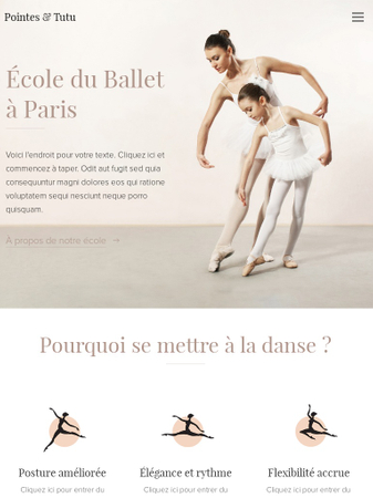 Présentez votre studio ou école de danse avec ce template léger et raffiné. Les couleurs ont été sélectionnées par nos graphistes pour suggérer l'élégance de la danse. Ajoutez sur le site toutes les informations nécessaires, comme les horaires des cours, présentez les profs de danse et publiez un article sur la dernière répétition générale. Votre site web sera tout simplement parfait !